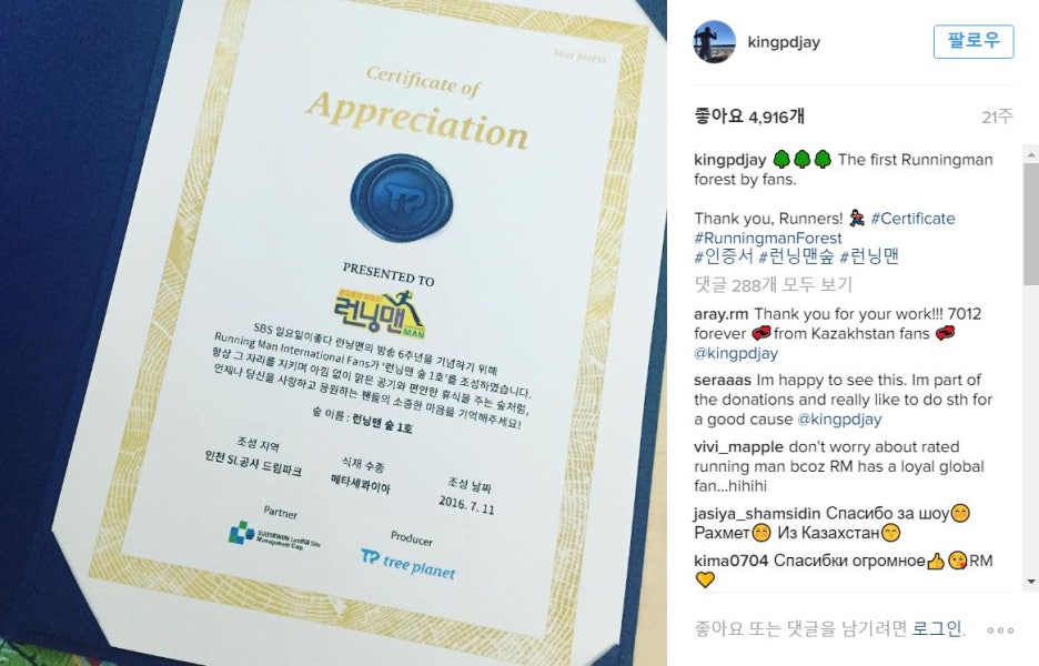런닝맨 PD가 감사증서와 함께 'The first Runningman forest by fans''Thank you, Runners!'라는 멘트를 SNS에 올려 팬들에게 감사를 전했다.