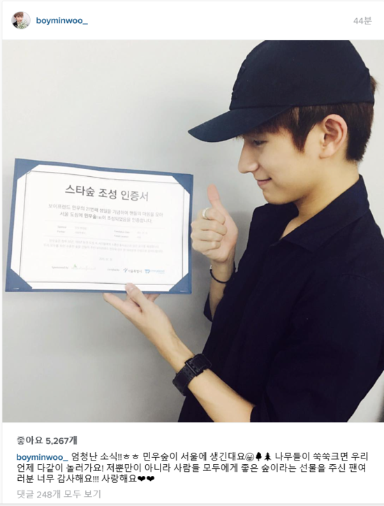 "엄청난 소식!!ㅎㅎ 민우숲이 서울에 생긴대요. 나무들이 쑥쑥크면 우리 언제 다같이 놀러가요! 저뿐만이 아니라 사람들 모두에게 좋은 숲이라는 선물을 주신 팬여러분 너무 감사해요!!! 사랑해요♥♥"라며 숲을 선물받은 기쁨을 드러냈다.