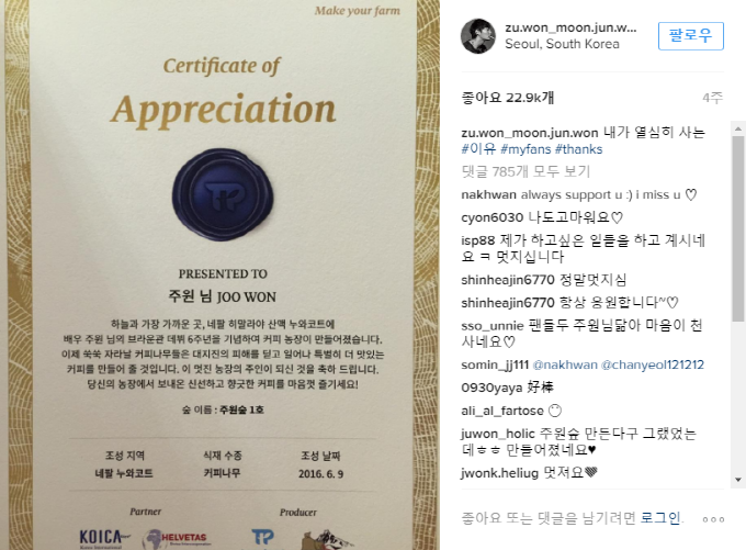주원은 감사증서를 받고 인스타그램에 '내가 열심히 사는 #이유 #myfans #thanks'라며 팬들에 대한 애정을 드러냈다.