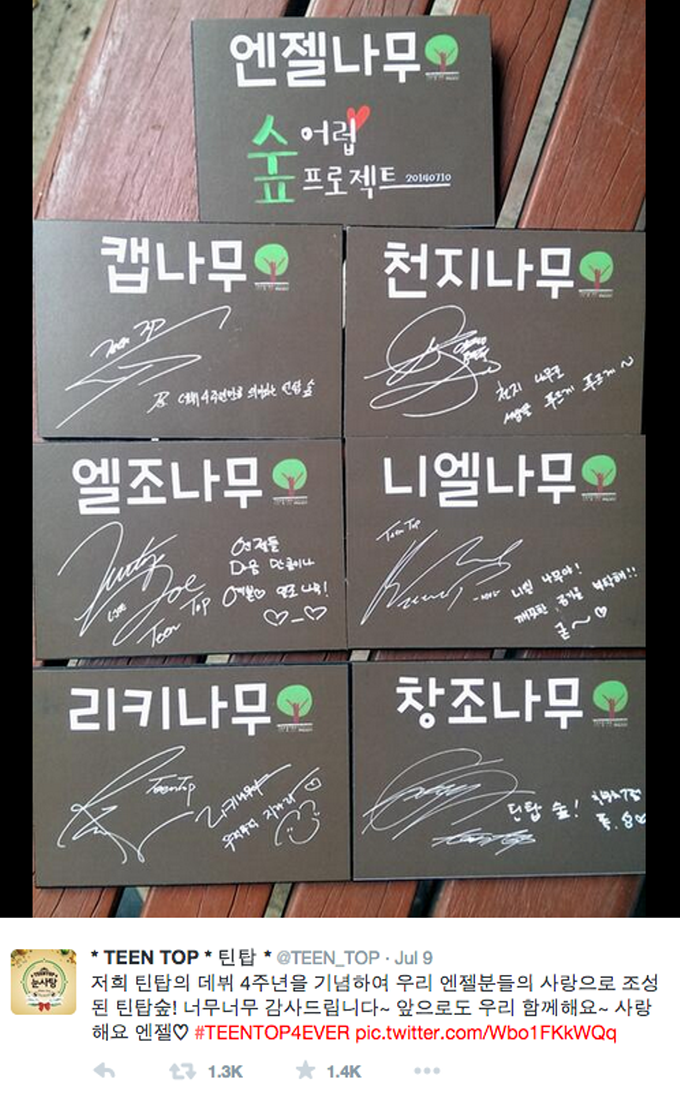 틴탑 멤버들은 자신들의 나무 이름표에 싸인과 팬들에게 보내는 메시지를 남긴 후 이를 직접 트윗했다.