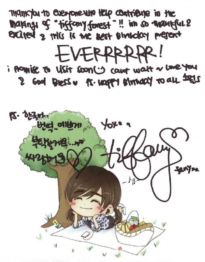 소녀시대의 또 다른 멤버 티파니도 생일을 기념하여 팬들에게 숲을 선물 받았다.