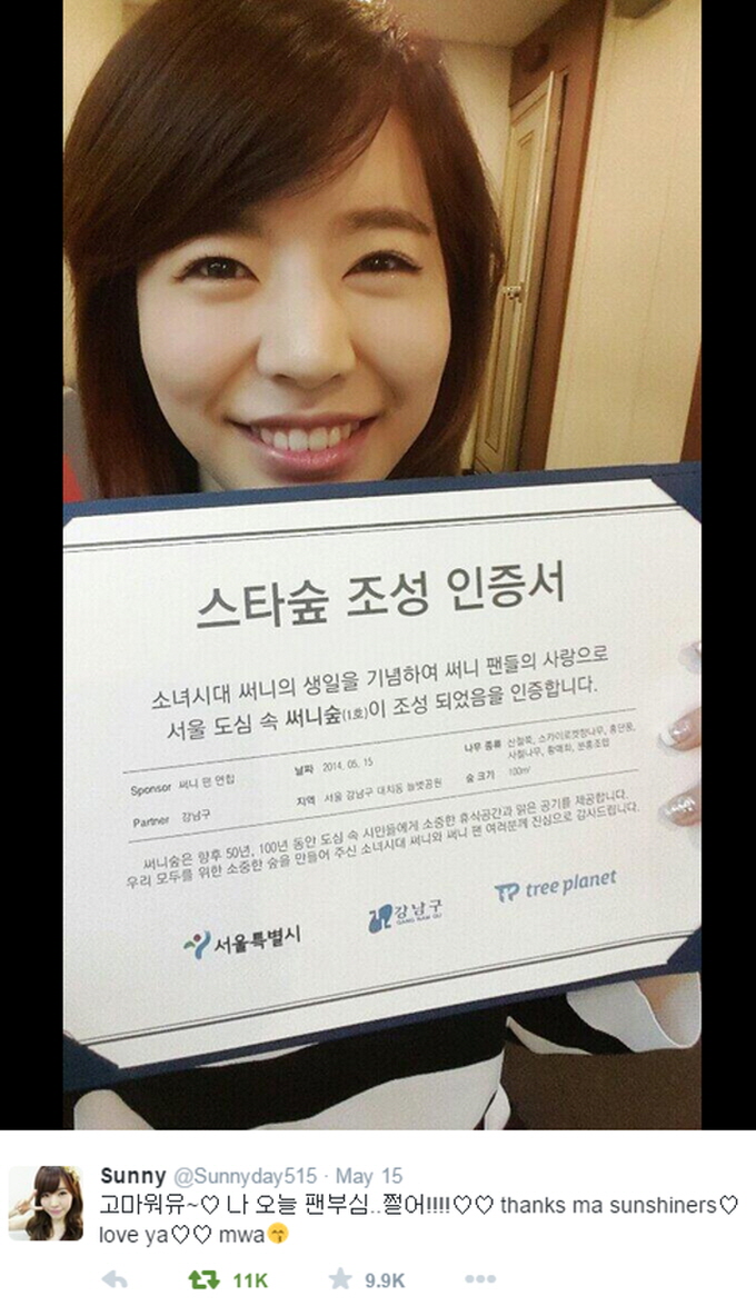 팬으로부터 스타숲 조성 인증서를 건네받고 트위터에 “고마워유~♡ 나 오늘 팬부심..쩔어!!!!♡♡thanks ma sunshiners♡ love ya♡♡mwa” 라며 직접 인증샷을 올리고 고마움을 표했다.