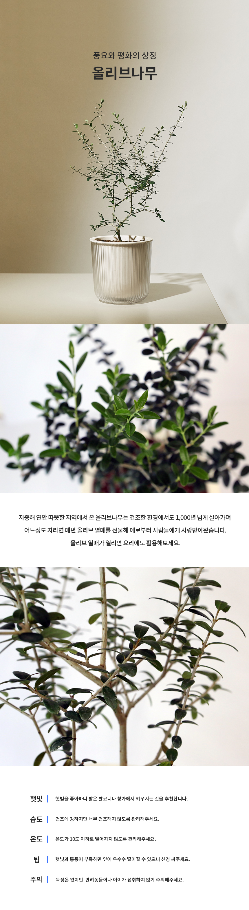 지중해 연안에서 온 올리브나무는 척박한 환경에서도 장수하며, 성목이 되면 매년 올리브 열매를 사람들에게 내주는 오랜 친구 같은 나무입니다.